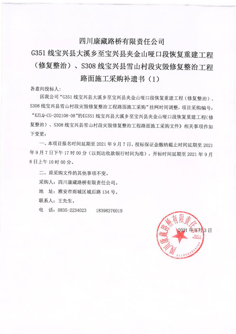 四川康藏路橋有限責任公司G351線寶興縣大溪鄉(xiāng)至寶興縣夾金山啞口段恢復重建工程(修復整治)、S308線寶興縣雪山村段災毀修復整治工程路面施工采購補遺書(1)