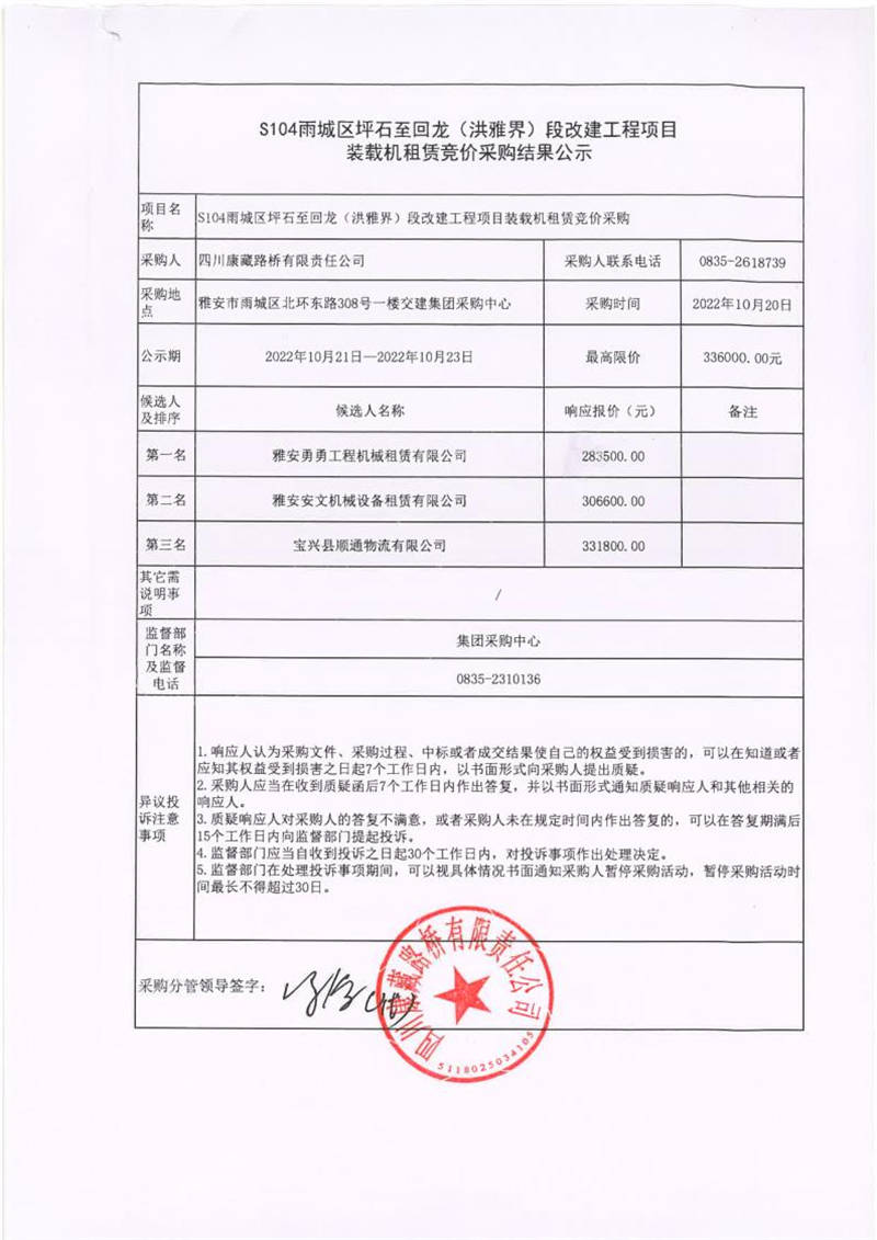 四川康藏路橋有限責(zé)任公司S104雨城區(qū)坪石至回龍(洪雅界)段改建工程項(xiàng)目裝載機(jī)租賃競(jìng)價(jià)采購結(jié)果公示
