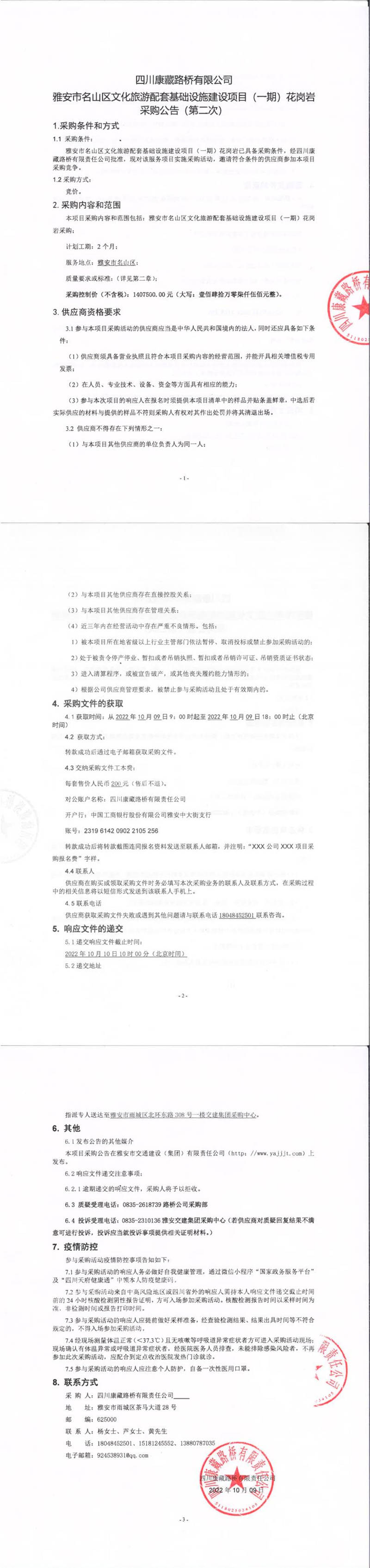 四川康藏路橋有限責任公司雅安市名山區(qū)文化旅游配套基礎(chǔ)設(shè)施建設(shè)項目(一期)花崗巖采購公告(第二次)