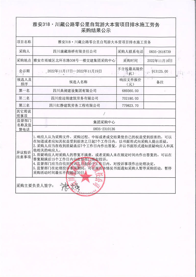 四川康藏路橋有限責任公司雅安318·川藏公路零公里自駕游大本營項目排水施工勞務采購結(jié)果公示