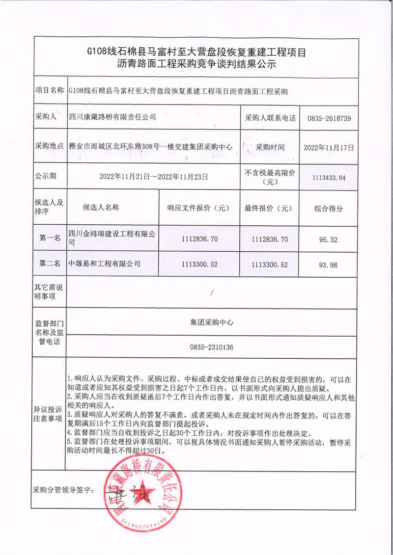 四川康藏路橋有限責任公司G108線石棉縣馬富村至大營盤段恢復重建工程項目瀝青路面工程采購競爭談判結果公示
