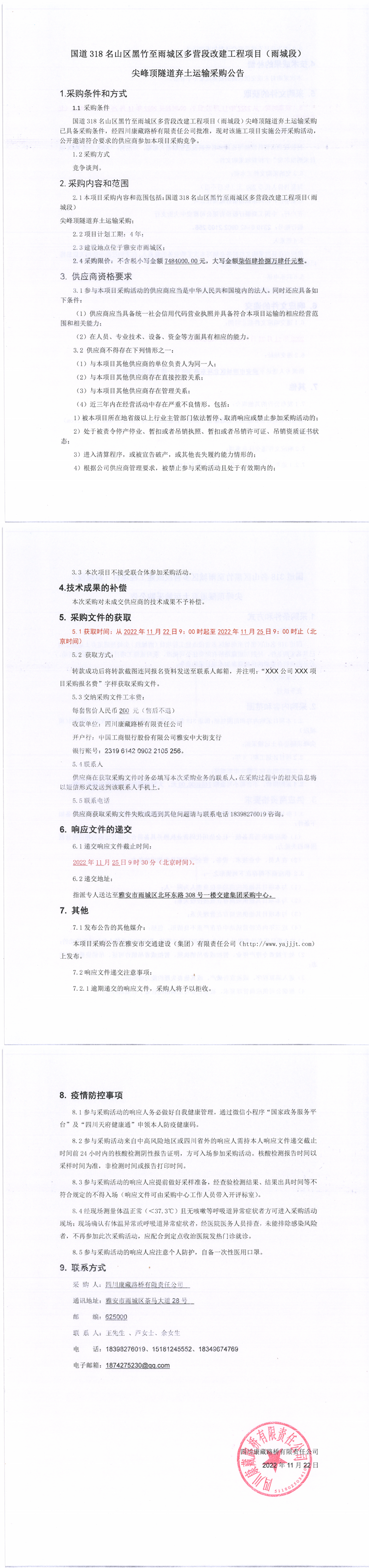 四川康藏路橋有限責(zé)任公司國(guó)道318名山區(qū)黑竹至雨城區(qū)多營(yíng)段改建工程項(xiàng)目(雨城段)尖峰頂隧道棄土運(yùn)輸采購公告