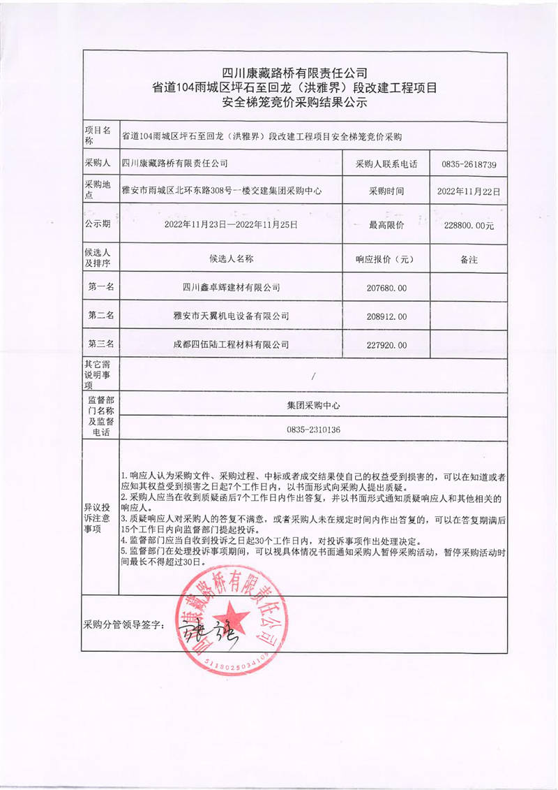 四川康藏路橋有限責(zé)任公司省道104雨城區(qū)坪石至回龍(洪雅界)段改建工程項(xiàng)目安全梯籠競價采購結(jié)果公示