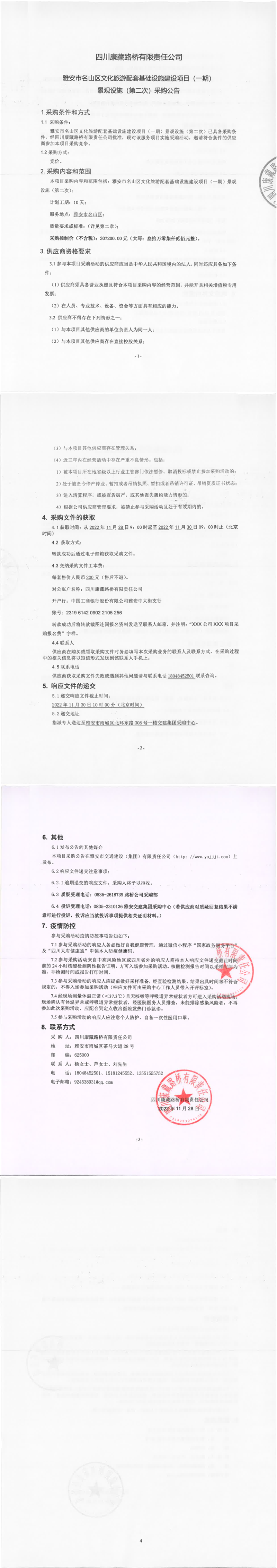 四川康藏路橋有限責(zé)任公司雅安市名山區(qū)文化旅游配套基礎(chǔ)設(shè)施建設(shè)項目(一期)景觀設(shè)施(第二次)采購公告