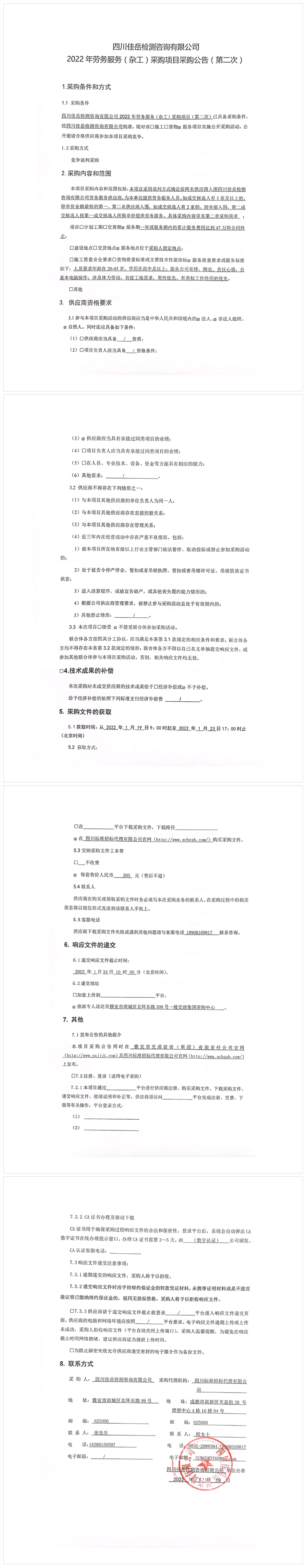 四川佳岳檢測咨詢有限公司2022年勞務服務(雜工)采購項目采購公告(第二次)