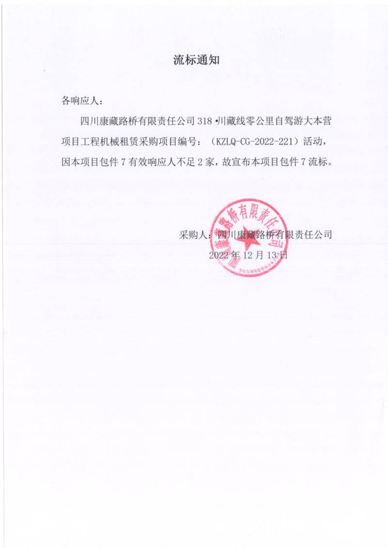 四川康藏路橋有限責(zé)任公司318.川藏線(xiàn)零公里自駕游大本營(yíng)項(xiàng)目工程機(jī)械租賃采購(gòu)(包件7)流標(biāo)通知