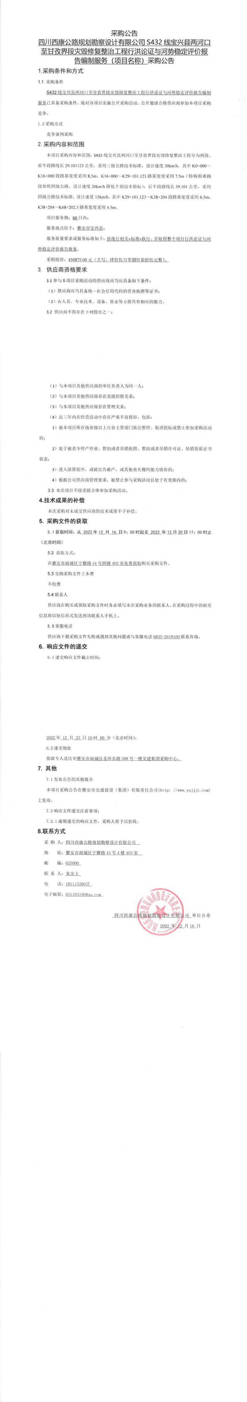 四川西康公路規(guī)劃勘察設計有限公司S432線寶興縣兩河口至甘孜界段災毀修復整治工程行洪論證與河勢穩(wěn)定評價報告編制服務(項目名稱)采購公告