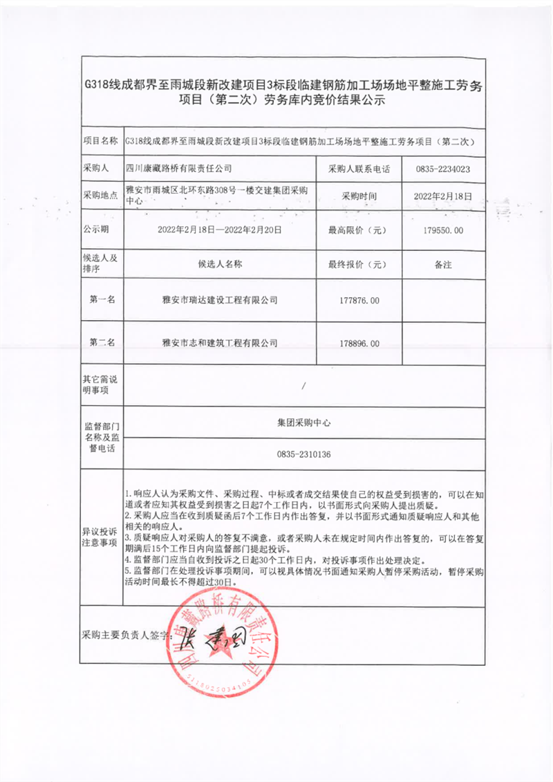 四川康藏路橋有限責(zé)任公司G318線成都界至雨城段新改建項(xiàng)目3標(biāo)段鋼筋加工場場地硬化施工勞務(wù)庫內(nèi)競價(jià)結(jié)果公示