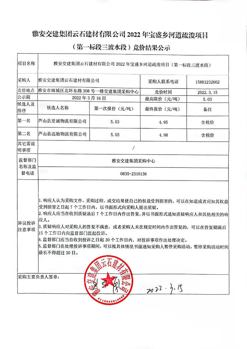 雅安交建集團(tuán)云石建材有限公司2022年寶盛鄉(xiāng)河道疏浚項(xiàng)目(第一標(biāo)段三渡水段)競價(jià)結(jié)果公示
