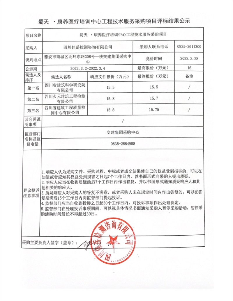 四川佳岳檢測(cè)咨詢有限公司蜀天.康養(yǎng)醫(yī)療培訓(xùn)中心工程技術(shù)服務(wù)采購(gòu)項(xiàng)目評(píng)標(biāo)結(jié)果公示