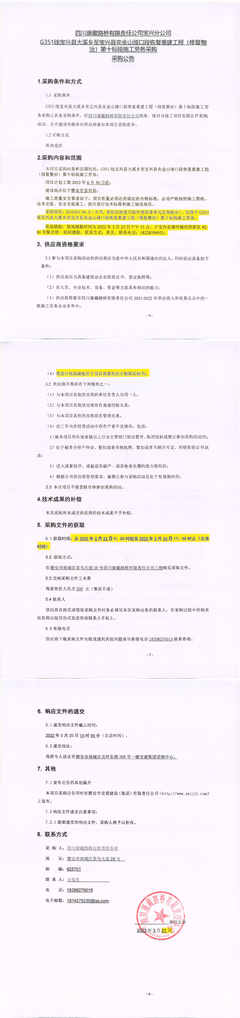 四川康藏路橋有限責(zé)任公司寶興分公司G351線寶興縣大溪鄉(xiāng)至寶興縣夾金山埡口段恢復(fù)重建工程(修復(fù)整治)第十標(biāo)段施工勞務(wù)采購(gòu)采購(gòu)公告