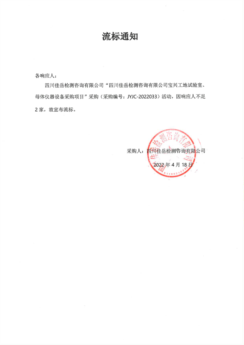 四川佳岳檢測(cè)咨詢有限公司寶興工地試驗(yàn)室、母體儀器設(shè)備采購(gòu)項(xiàng)目流標(biāo)通知