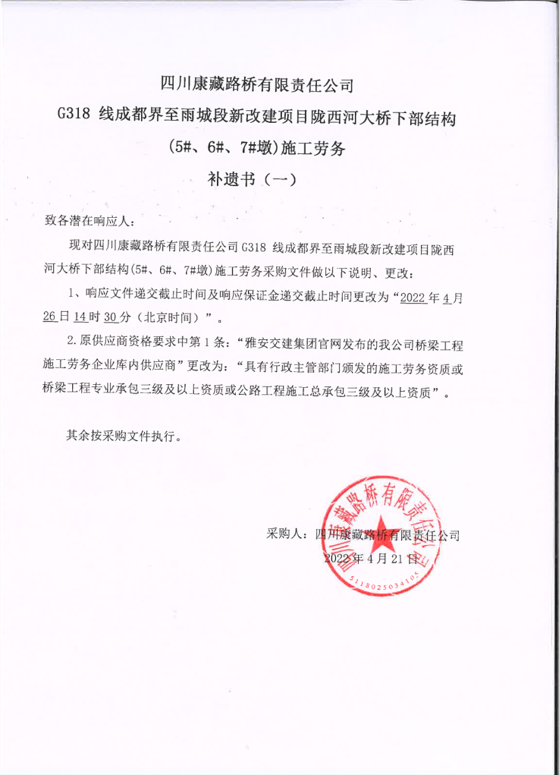 四川康藏路橋有限責(zé)任公司G318線成都界至雨城段新改建項目隴西河大橋下部結(jié)構(gòu)(5#、6#、7#墩)施工勞務(wù)補(bǔ)遺書(一)
