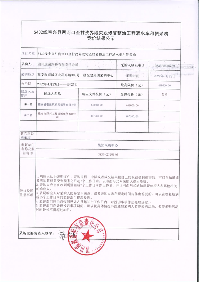 四川康藏路橋有限責(zé)任公司S432線寶興縣兩河口至甘孜界段災(zāi)毀修復(fù)整治工程灑水車(chē)租賃采購(gòu)競(jìng)價(jià)結(jié)果公示