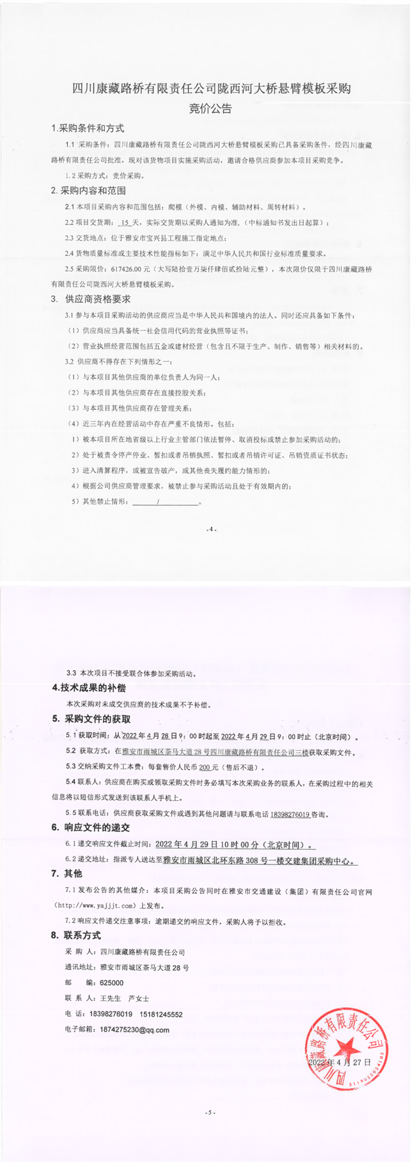 四川康藏路橋有限責(zé)任公司隴西河大橋懸臂模板采購競價公告