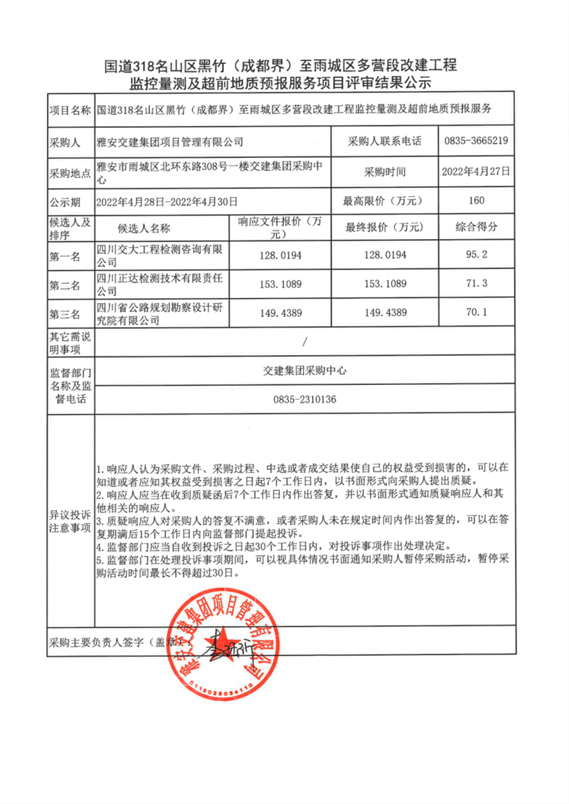 雅安交建集團(tuán)項(xiàng)目管理有限公司國道318名山區(qū)黑竹(成都界)至雨城區(qū)多營段改建工程監(jiān)控量測及超前地質(zhì)預(yù)報服務(wù)項(xiàng)目評審結(jié)果公示