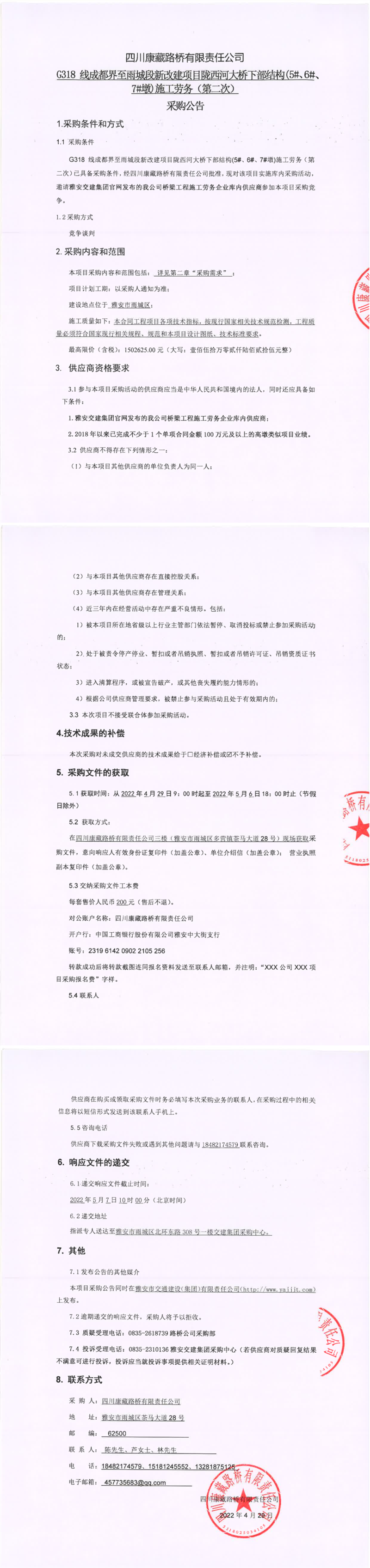 四川康藏路橋有限責(zé)任公司G318線成都界至雨城段新改建項(xiàng)目隴西河大橋下部結(jié)構(gòu)(5#、6#、7#墩)施工勞務(wù)(第二次)采購(gòu)公告