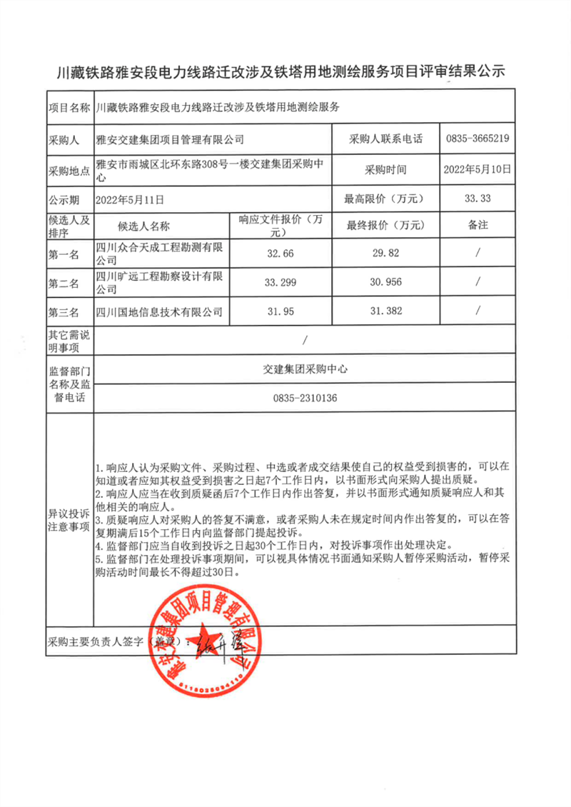 雅安交建集團項目管理有限公司川藏鐵路雅安段電力線路遷改涉及鐵塔用地測繪服務項目評審結(jié)果公示