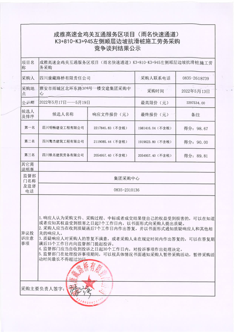四川康藏路橋有限責(zé)任公司成雅高速金雞關(guān)互通服務(wù)區(qū)項(xiàng)目(雨名快速通道)K3+810-K3+945左側(cè)順層邊坡抗滑樁施工勞務(wù)采購競爭談判結(jié)果公示