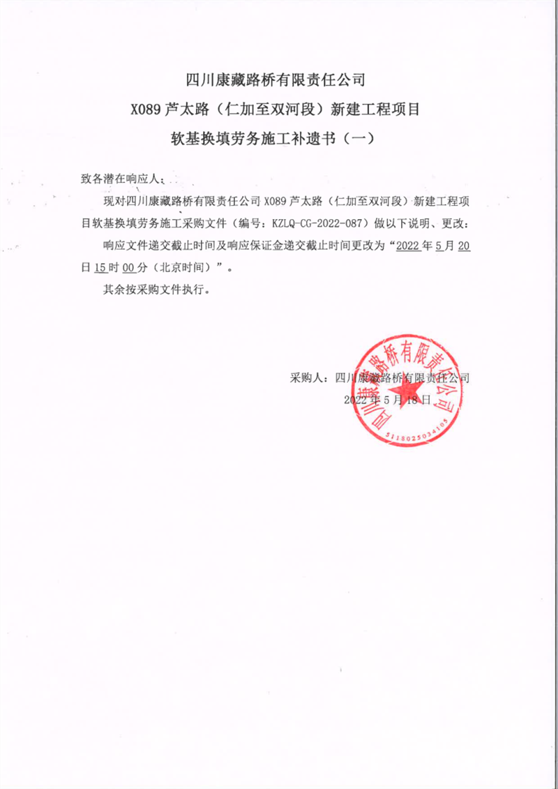 四川康藏路橋有限責(zé)任公司X089蘆太路(仁加至雙河段)新建工程項(xiàng)目軟基換填勞務(wù)施工補(bǔ)遺書(一)
