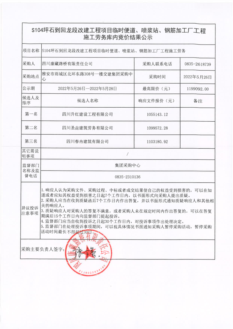 四川康藏路橋有限責任公司S104坪石到回龍改建工程項目臨時便道、噴漿站、鋼筋加工廠工程施工勞務庫內競價結果公示