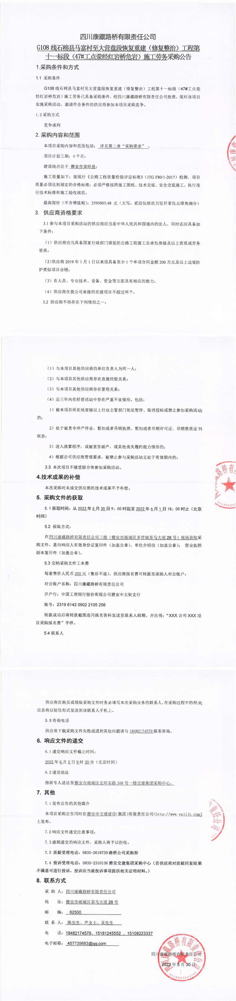四川康藏路橋有限責(zé)任公司G108線石棉縣馬富村至大營(yíng)盤段恢復(fù)重建(修復(fù)整治)工程第十一標(biāo)段(47#工點(diǎn)滎經(jīng)紅巖橋危巖)施工勞務(wù)采購(gòu)公告