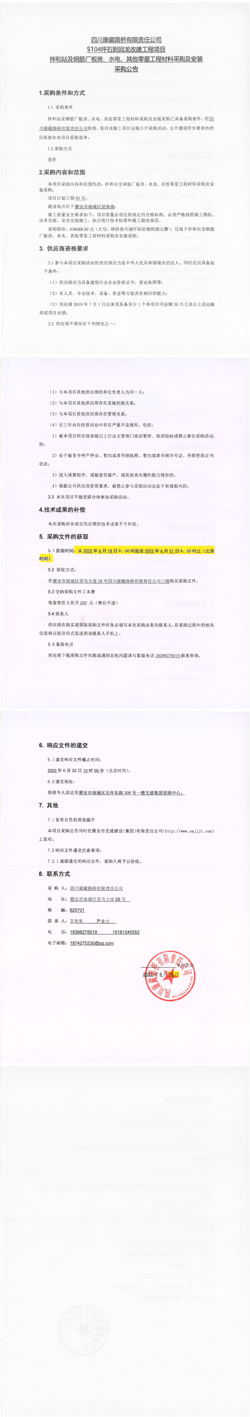 四川康藏路橋有限責任公司S104坪石到回龍改建工程項目拌和站及鋼筋廠板房、水電、其他零星工程材料采購及安裝采購公告