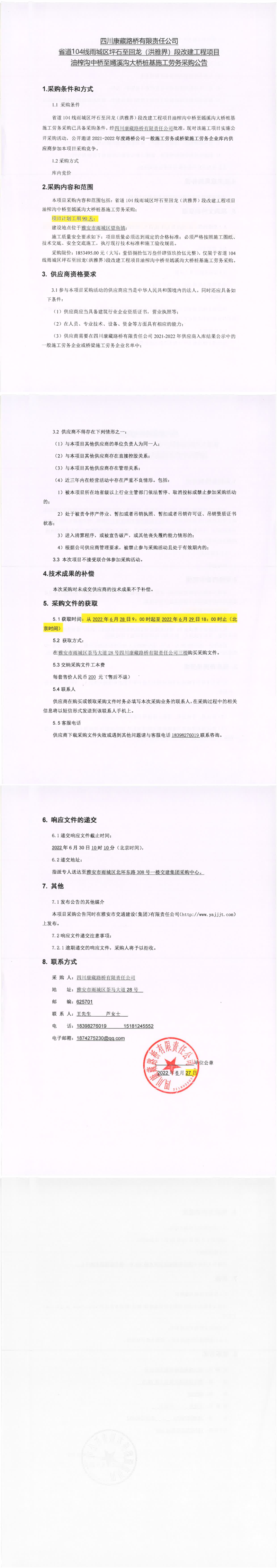 四川康藏路橋有限責(zé)任公司省道104線雨城區(qū)坪石至回龍(洪雅界)段改建工程項(xiàng)目錢壩大橋、望魚大橋樁基及鋼便橋工程施工勞務(wù)采購(gòu)公告