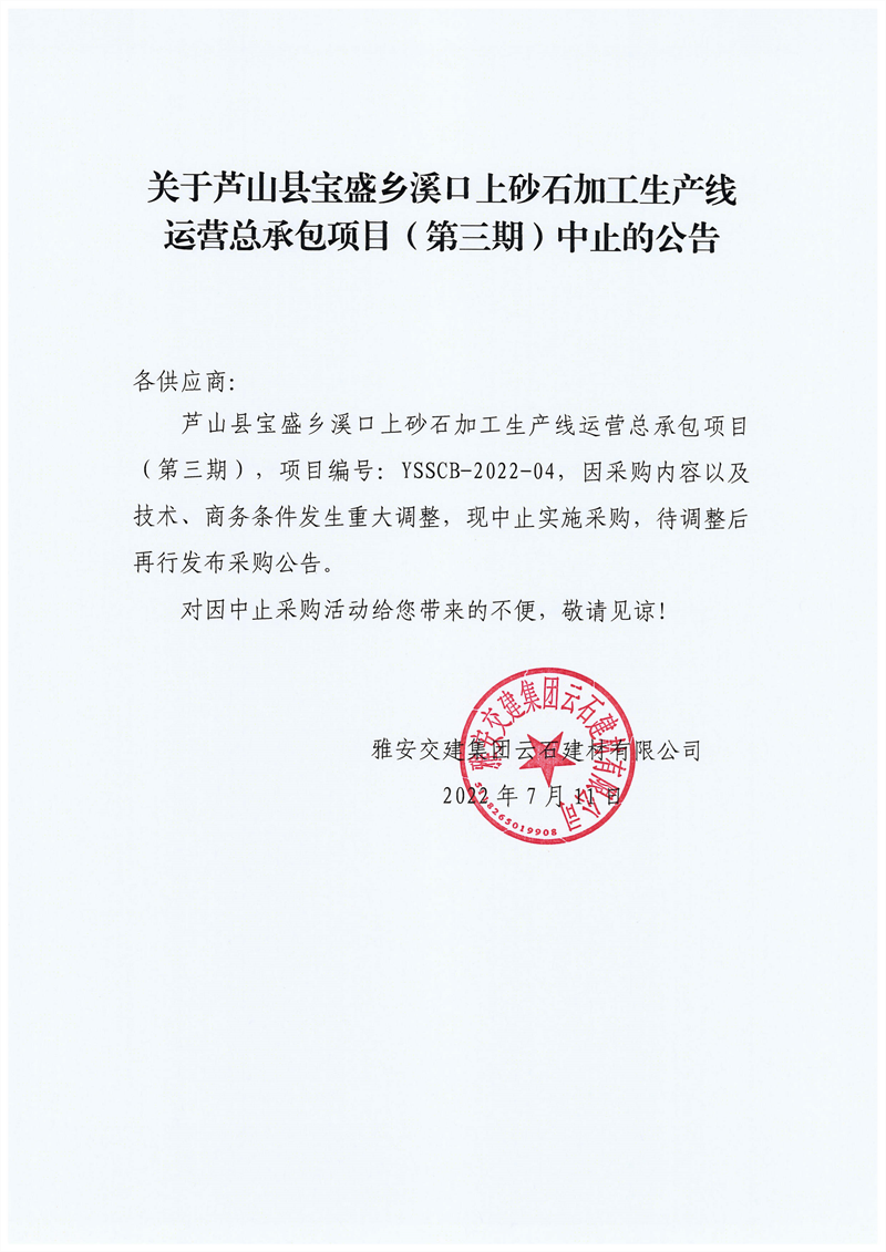 雅安交建集團(tuán)云石建材有限公司關(guān)于蘆山縣寶盛鄉(xiāng)溪口上砂石加工生產(chǎn)線運(yùn)營總承包項(xiàng)目(第三期)中止的公告