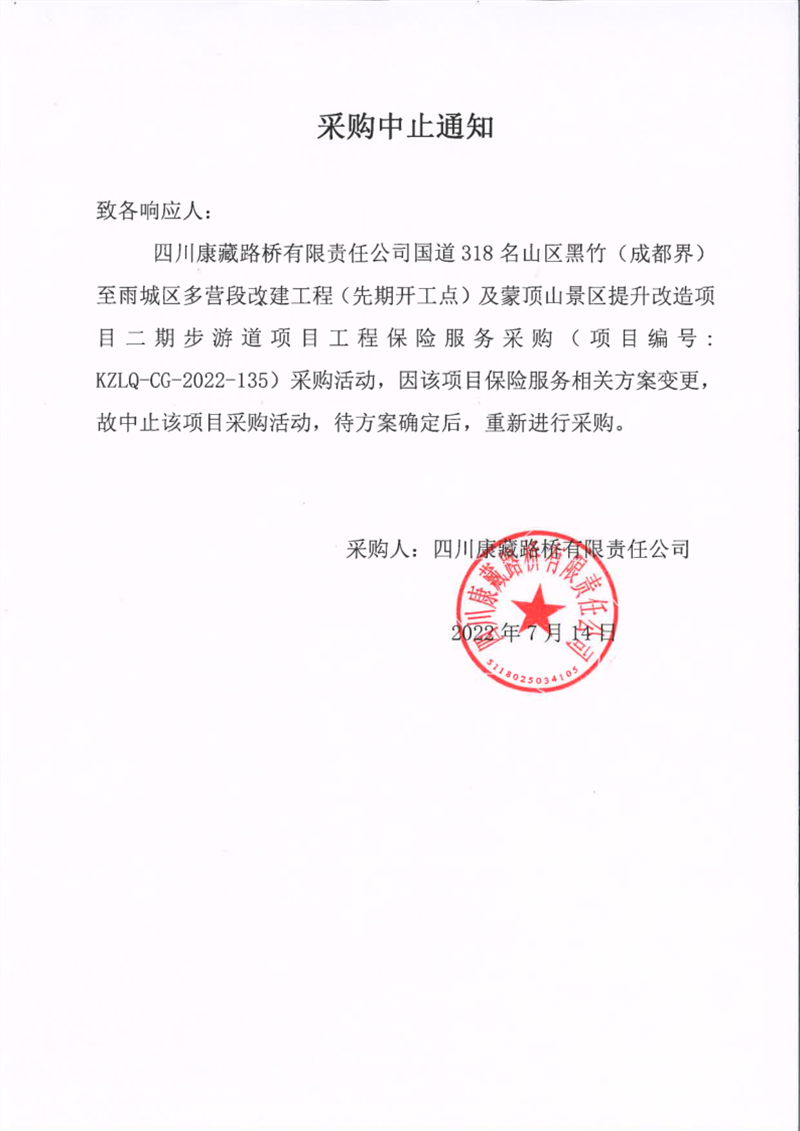 四川康藏路橋有限責(zé)任公司國(guó)道318名山區(qū)黑竹(成都界)至雨城區(qū)多營(yíng)段改建工程(先期開工點(diǎn))及蒙頂山景區(qū)提升改造項(xiàng)目二期步游道項(xiàng)目工程保險(xiǎn)服務(wù)采購中止通知