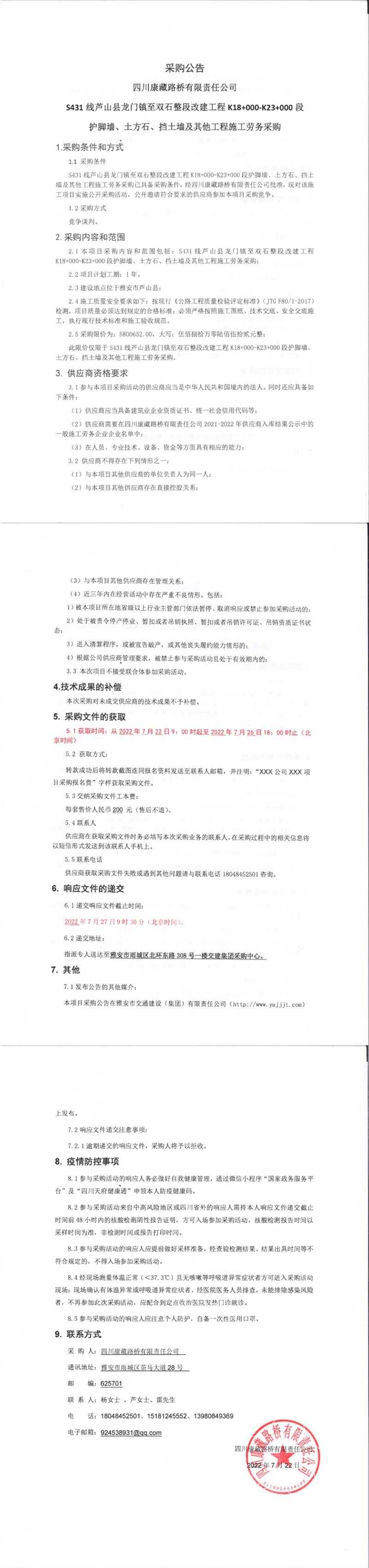四川康藏路橋有限責(zé)任公司S431線蘆山縣龍門鎮(zhèn)至雙石整段改建工程K18+000-K23+000段護腳墻、土方石、擋土墻及其他工程施工勞務(wù)采購