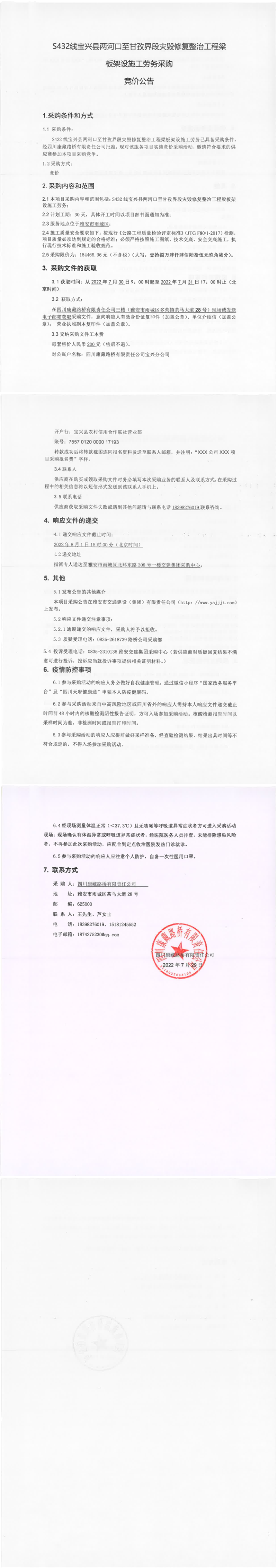 四川康藏路橋有限責(zé)任公司S432線寶興縣兩河口至甘孜界段災(zāi)毀修復(fù)整治工程梁板架設(shè)施工勞務(wù)采購(gòu)競(jìng)價(jià)公告