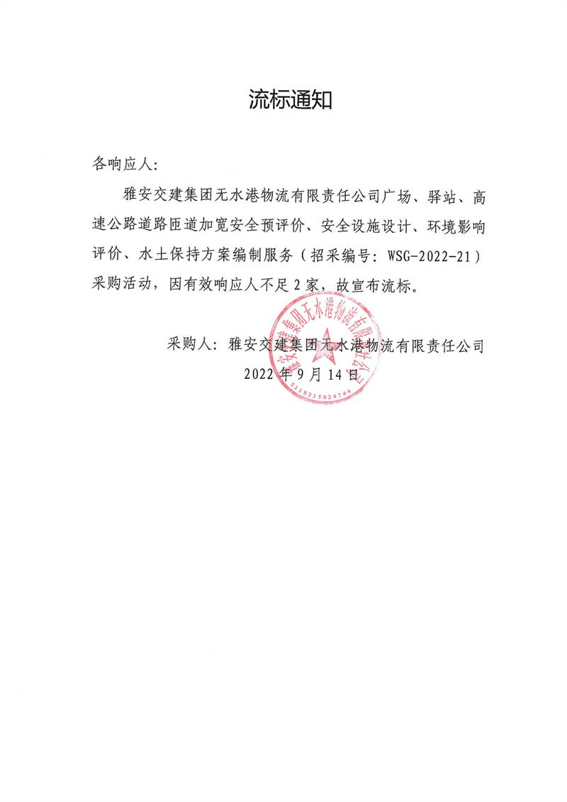 雅安交建集團無水港物流有限責任公司廣場、驛站、高速公路道路匝道加寬安全預評價、安全設施設計、環(huán)境影響評價、水土保持方案編制服務采購流標通知