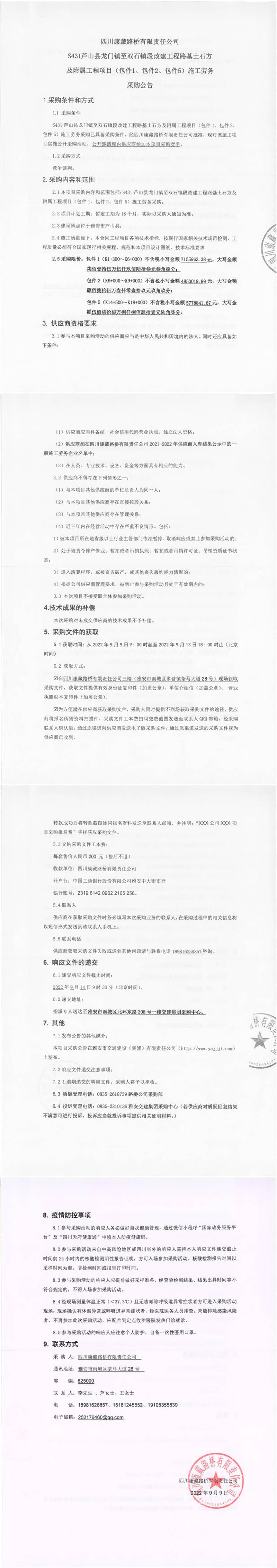 四川康藏路橋有限責(zé)任公司S431蘆山縣龍門鎮(zhèn)至雙石段改建工程路基土石方及附屬工程項目(包件1、包件2、包件5)施工勞務(wù)采購公告