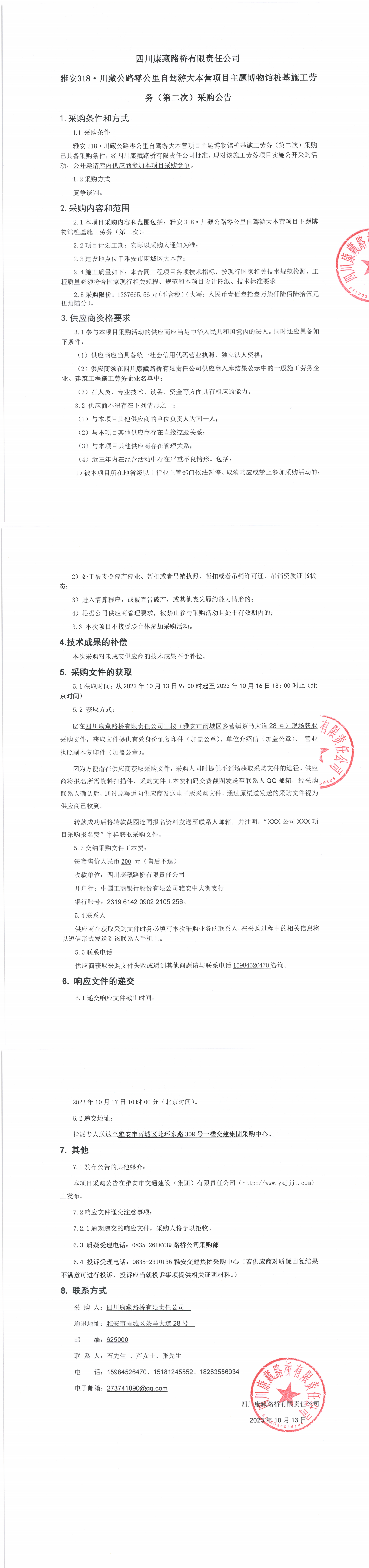 四川康藏路橋有限責(zé)任公司雅安318·川藏公路零公里自駕游大本營項目主題博物館樁基施工勞務(wù)(第二次)采購公告