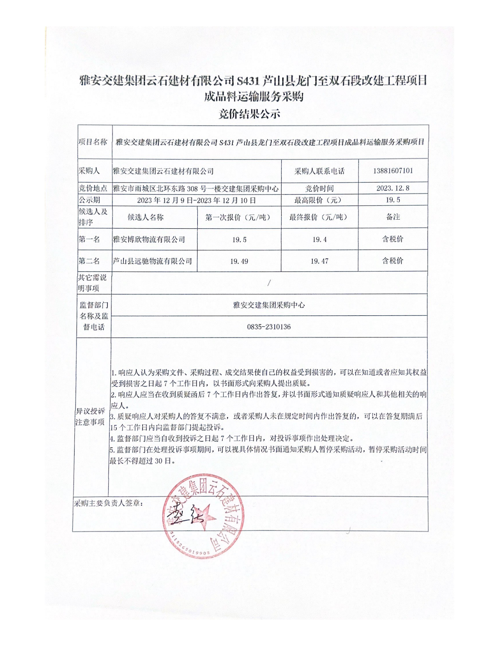 雅安交建集團云石建材有限公司S431蘆山縣龍門至雙石段改建工程項目成品料運輸服務采購競價結果公示