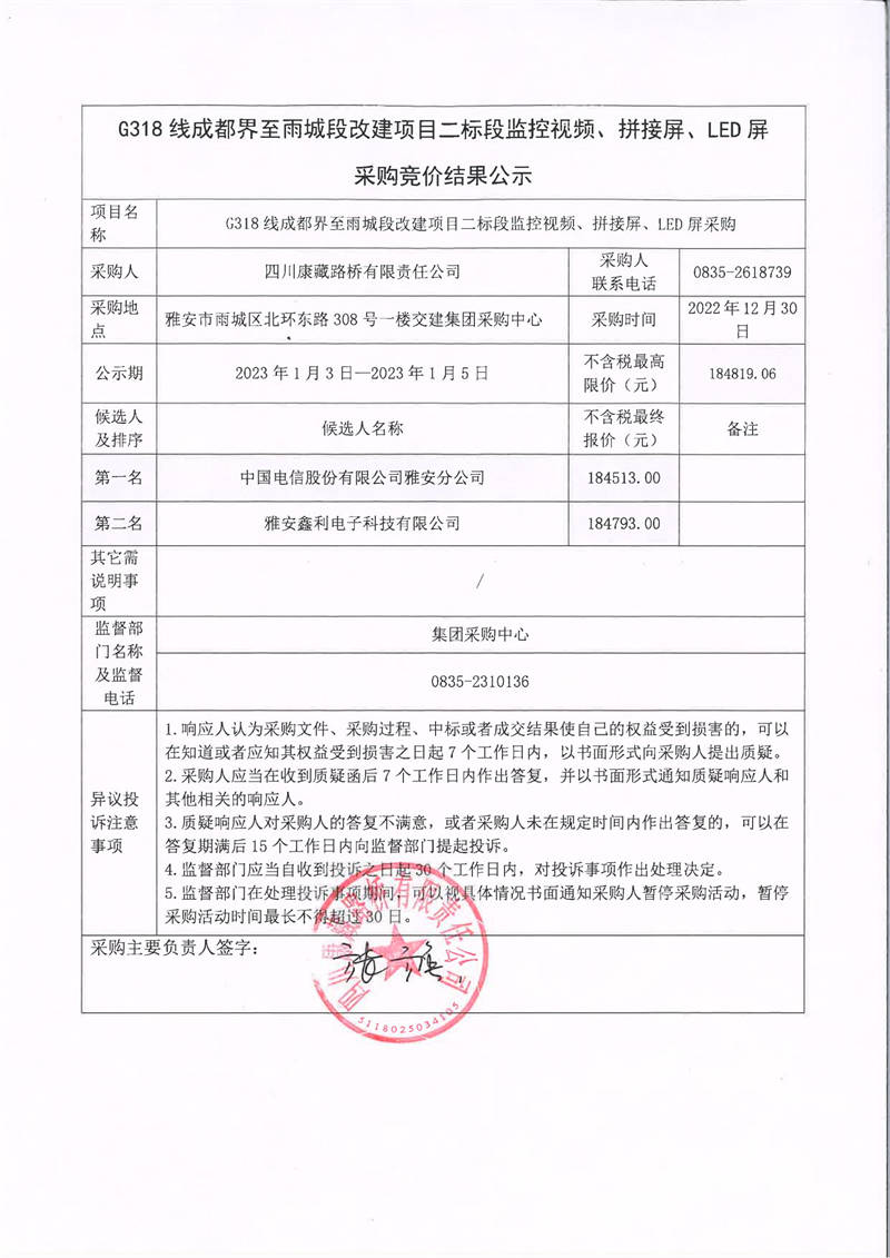 四川康藏路橋有限責(zé)任公司G318線成都界至雨城段改建項(xiàng)目二標(biāo)段監(jiān)控視頻、拼接屏、LED屏采購(gòu)競(jìng)價(jià)結(jié)果公示