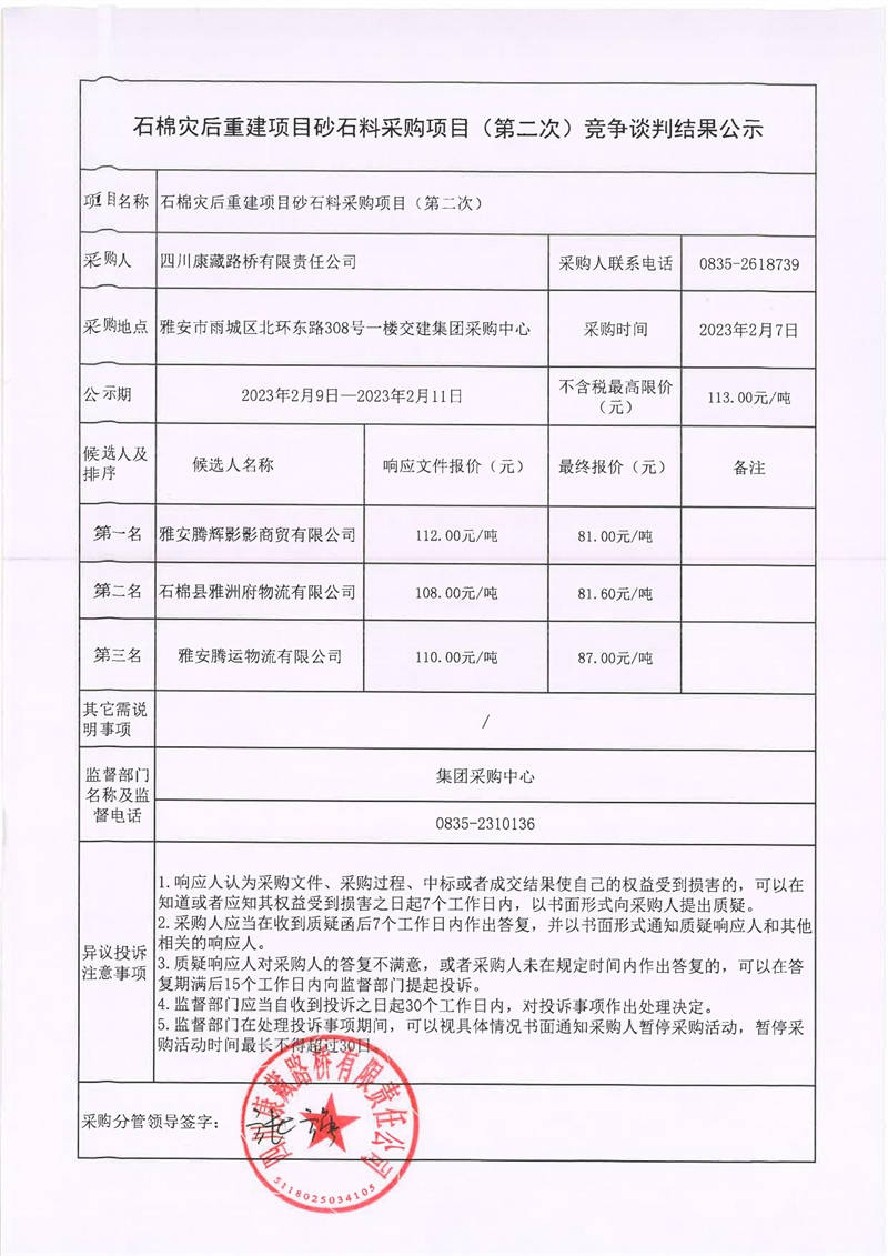 四川康藏路橋有限責(zé)任公司石棉災(zāi)后重建項(xiàng)目砂石料采購(gòu)項(xiàng)目(第二次)競(jìng)爭(zhēng)談判結(jié)果公示