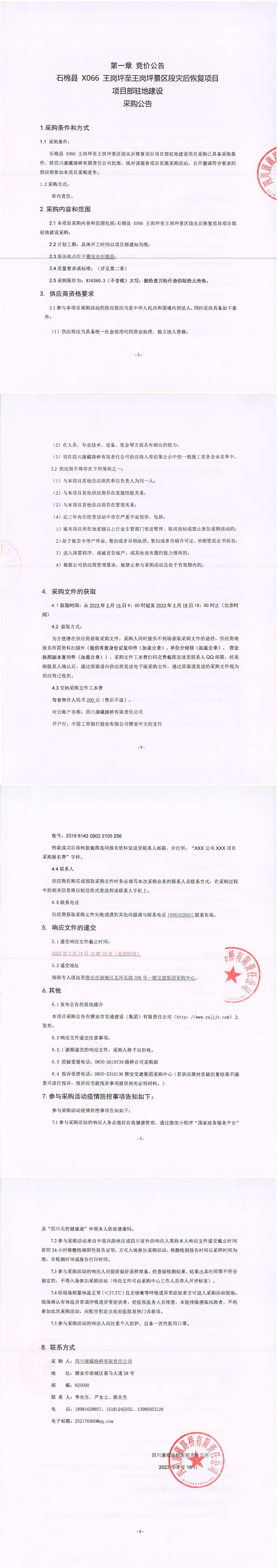 四川康藏路橋有限責任公司石棉縣X066王崗坪至王崗坪景區(qū)災后恢復項目項目部駐地建設(shè)采購公告