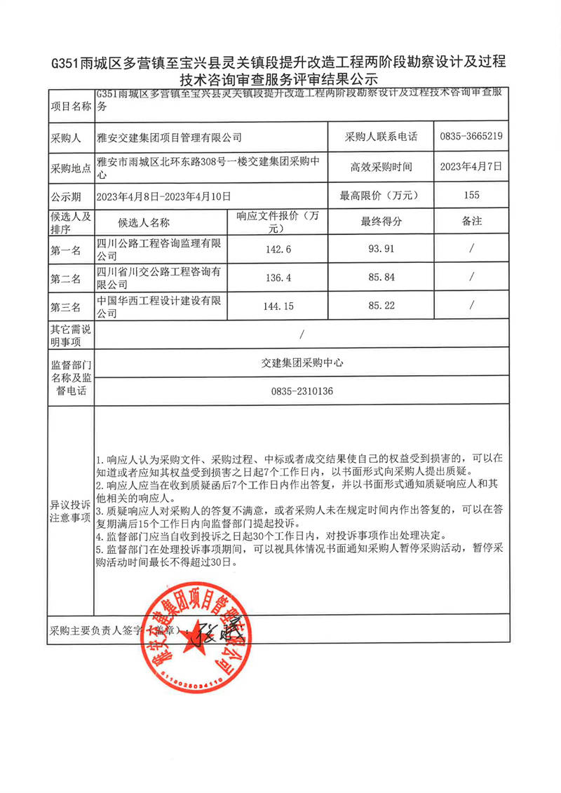 雅安交建集團(tuán)項(xiàng)目管理有限公司G351雨城區(qū)多營鎮(zhèn)至寶興縣靈關(guān)鎮(zhèn)段提升改造工程兩階段勘察設(shè)計(jì)及過程技術(shù)咨詢審查服務(wù)評(píng)審結(jié)果公示