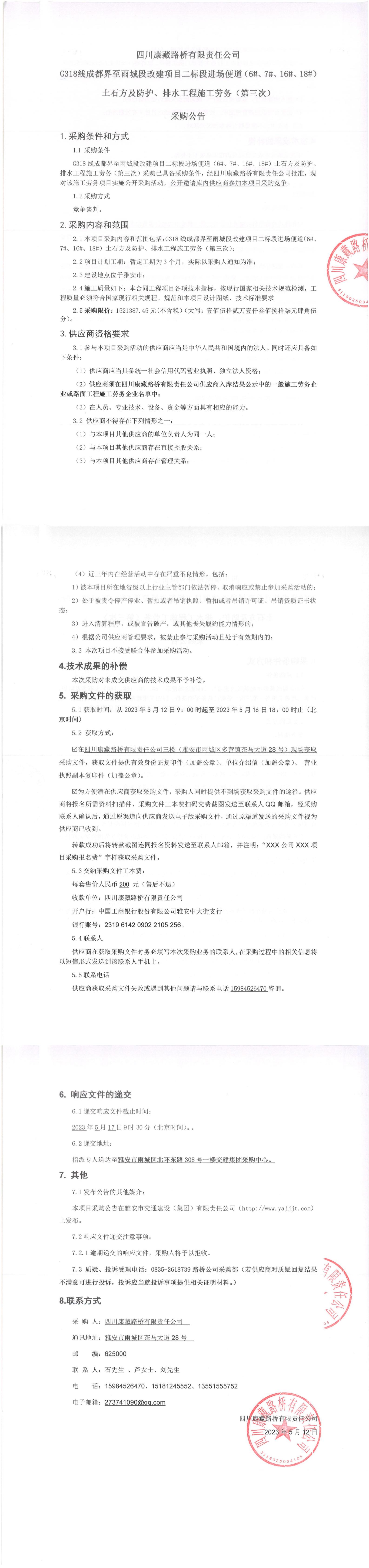 四川康藏路橋有限責(zé)任公司G318線成都至雨城段改建項目二標段進場便道(6#、7#、16#、18#)土石方及防護、排水工程施工勞務(wù)(第三次)采購公告