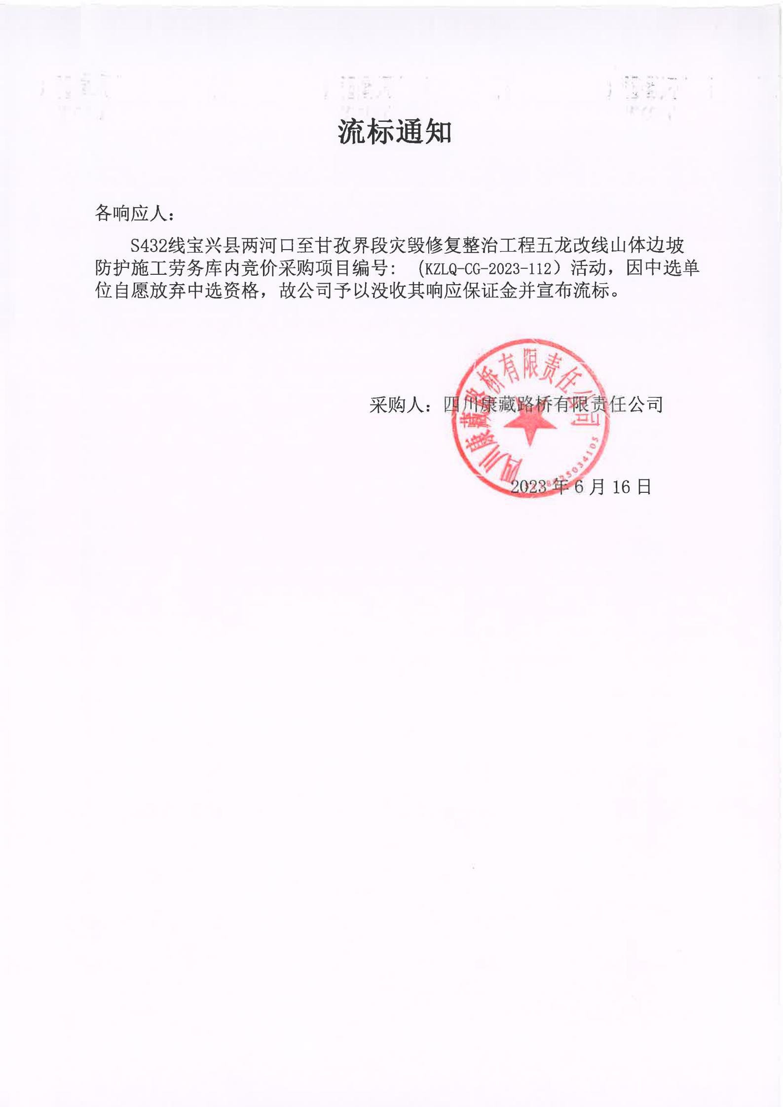 四川康藏路橋有限責(zé)任公司S432線寶興縣兩河口至甘孜界段災(zāi)毀修復(fù)整治工程五龍改線山體邊坡防護(hù)施工勞務(wù)庫內(nèi)競(jìng)價(jià)流標(biāo)通知