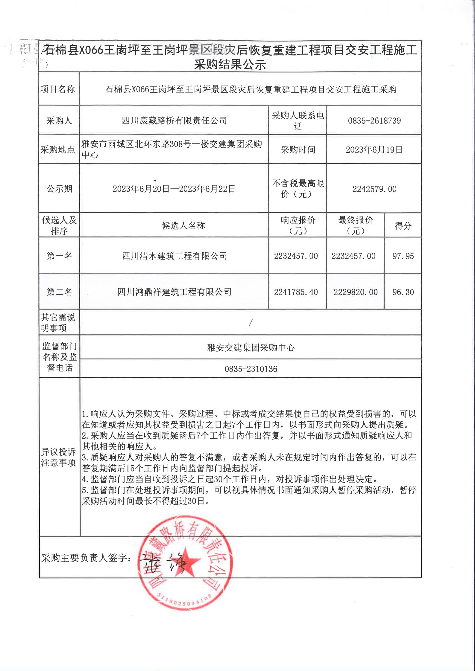 四川康藏路橋有限責任公司石棉縣X066王崗坪至王崗坪景區(qū)段災(zāi)后恢復重建工程項目交安工程施工采購結(jié)果公示