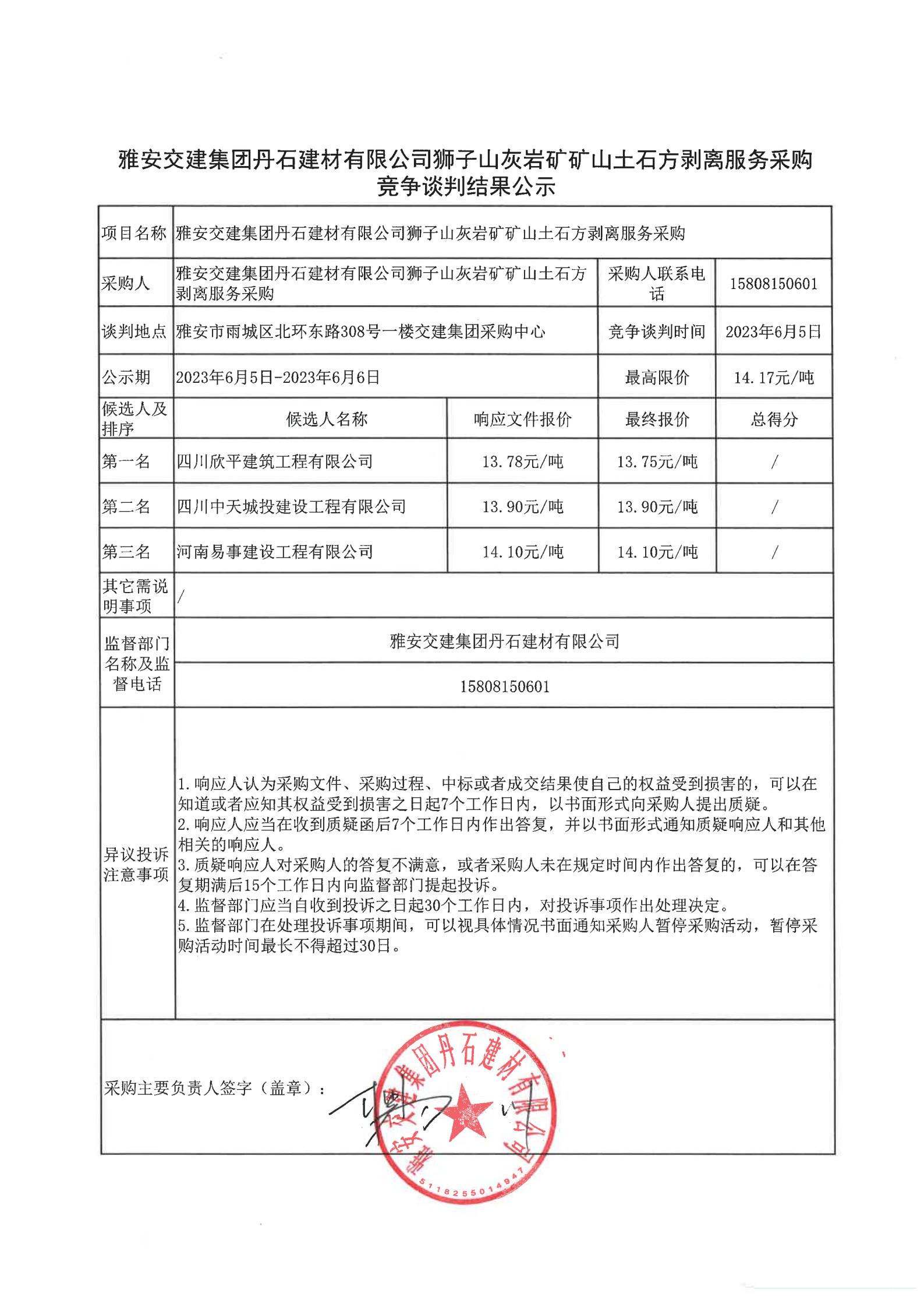 雅安交建集團丹石建材有限公司獅子山灰?guī)r礦礦山土石方剝離服務采購競爭談判結(jié)果公示