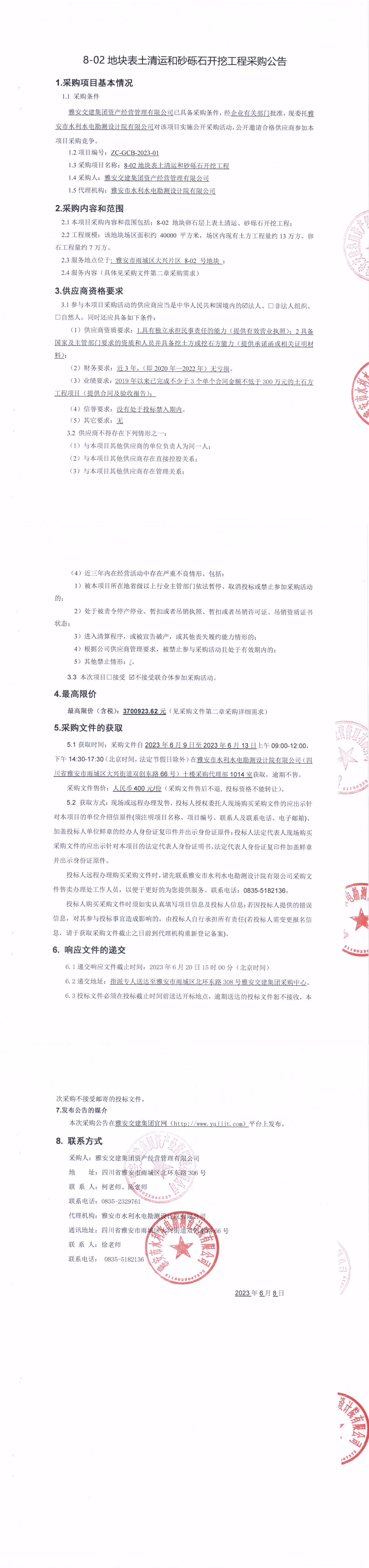雅安交建集團資產經營管理有限公司8-02地塊表土清運和砂礫石開挖工程采購公告