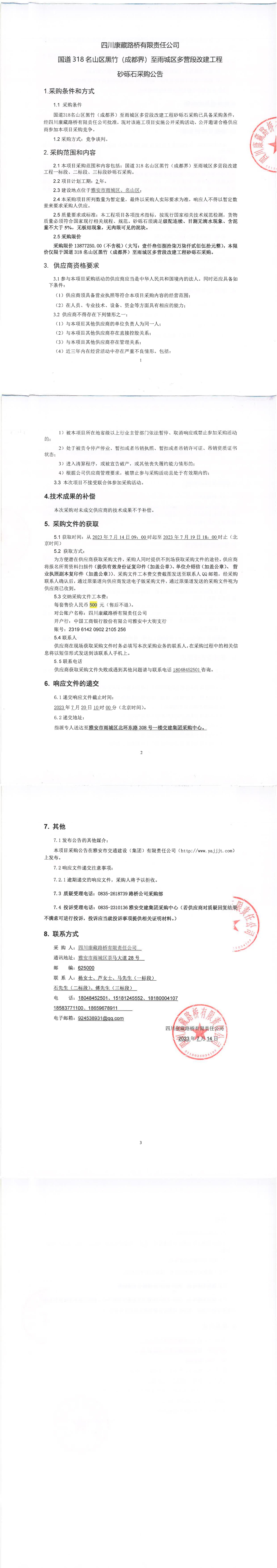 四川康藏路橋有限責(zé)任公司國(guó)道318名山區(qū)黑竹(成都界)至雨城區(qū)多營(yíng)段改建工程砂礫石采購(gòu)公告