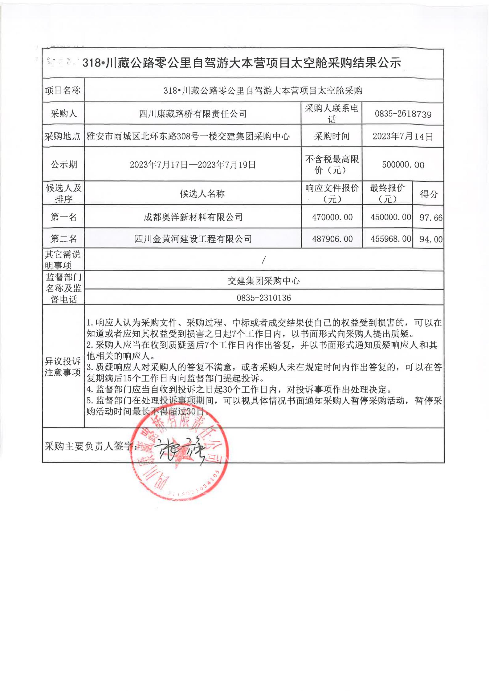 四川康藏路橋有限責(zé)任公司318·川藏公路零公里自駕游大本營項目太空艙采購結(jié)果公示