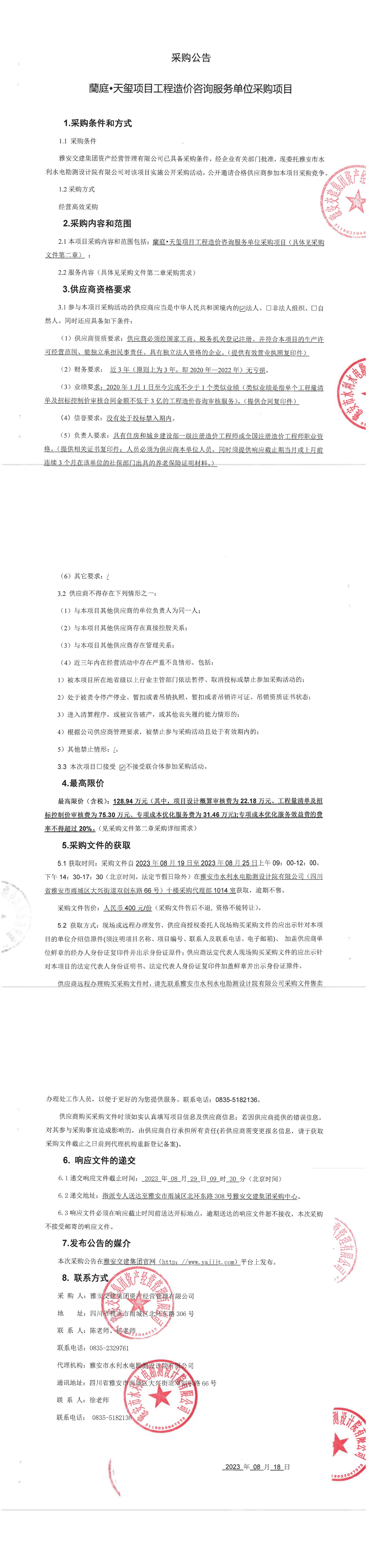 雅安交建集團資產(chǎn)經(jīng)營管理有限公司蘭庭·天璽項目工程造價咨詢服務(wù)單位采購項目采購公告