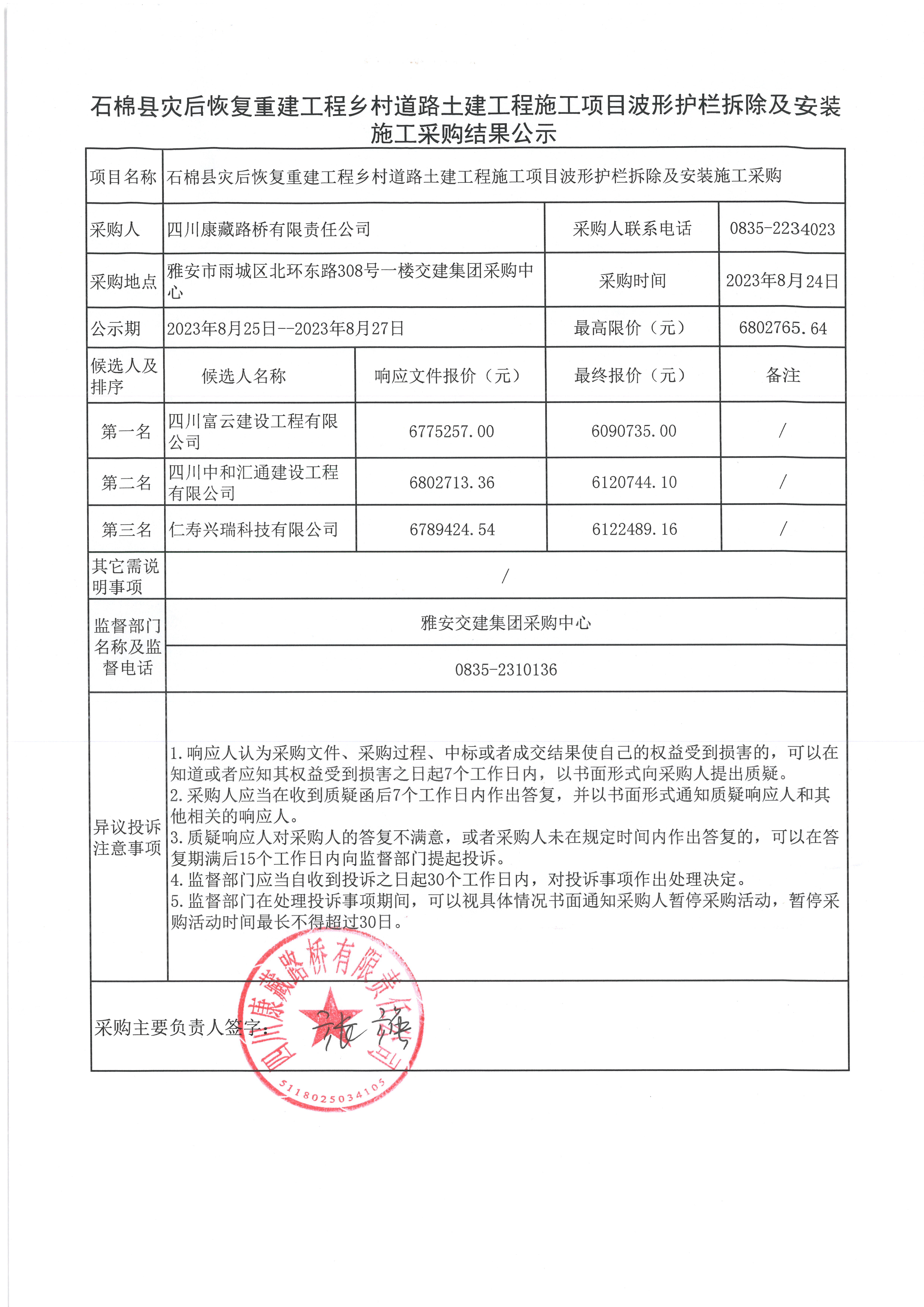 石棉縣災(zāi)后恢復(fù)重建工程鄉(xiāng)村道路土建工程施工項目波形護(hù)欄拆除及安裝施工采購結(jié)果公示