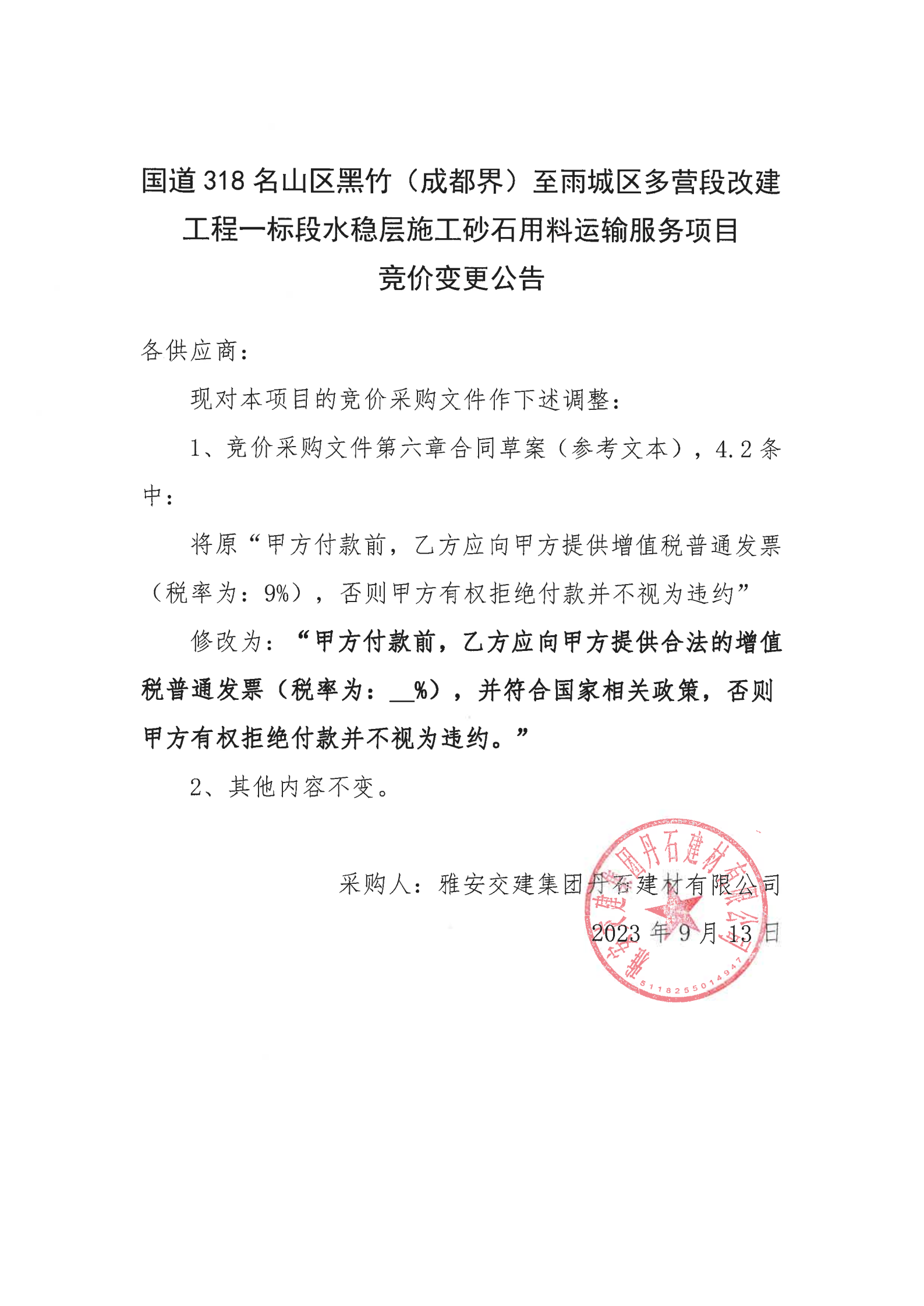 雅安交建集團(tuán)丹石建材有限公司國道318名山區(qū)黑竹(成都界)至雨城區(qū)多營段改建工程一標(biāo)段水穩(wěn)層施工砂石用料運(yùn)輸服務(wù)項(xiàng)目競(jìng)價(jià)變更公告
